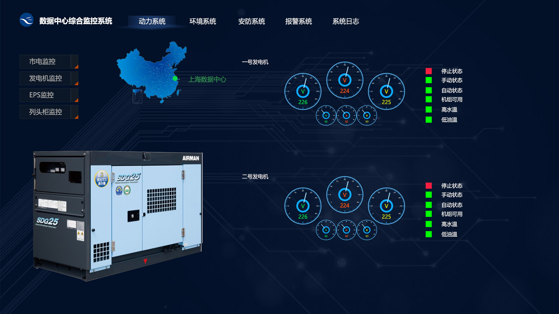 通過發電機廠家提供的智能接口和通訊協議,綜合監控系統采集發電機的各種狀態值,數據中心管理人員可以實時掌握發電機的工作狀態。